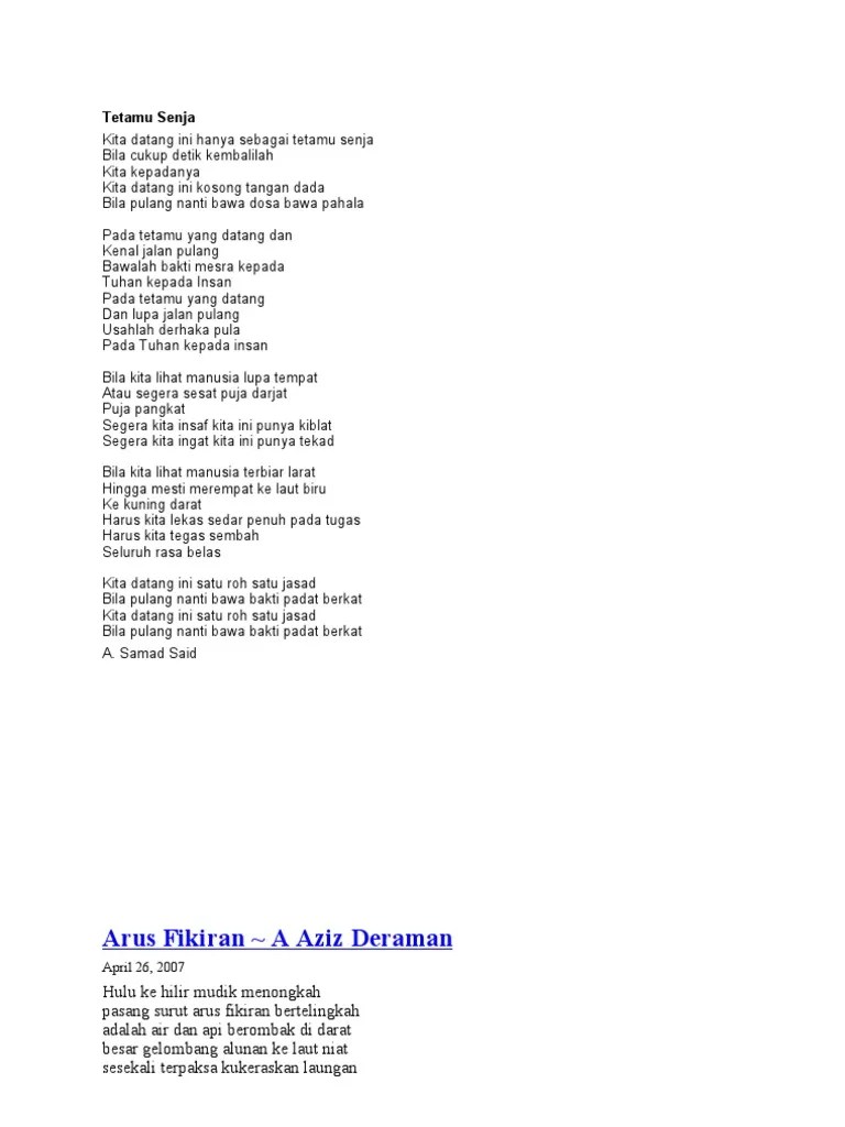 Samad said at the discogs marketplace. b "mahasiswa" karya usman awang. d "sepanjang jalan ke pulau pinang" . Tetamu senja kita datang ini hanya sebagai tetamu senjabila . Tetamu senja kita datang ini hanya sebagai tetamu senjabila cukup detik kembalilahkita kepadanyakita datang ini kosong tangan dadabila .